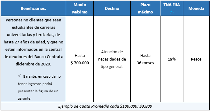 Los beneficiarios de esta nueva línea de préstamos personales son los estudiantes de carreras universitarias y terciarias, de hasta 27 años de edad, no clientes del Banco Ciudad y que a diciembre del 2020 no presenten deudas en el sistema financiero. El monto del crédito al que podrán acceder – hasta un máximo de $700.000 – dependerá de los ingresos demostrables y quienes no los posean podrán presentar un garante.